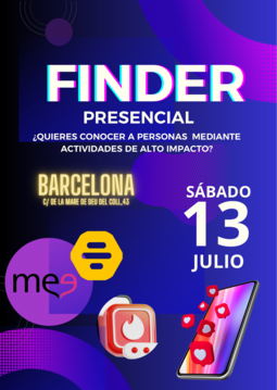 FINDER PRESENCIAL es un evento único y vivencial de 10:30 a 13h, donde los y las participantes se sumergen en un simulador de aplicaciones de citas pero presencialmente y tienen la oportunidad de conocer a otras personas mediante actividades de alto impacto.
